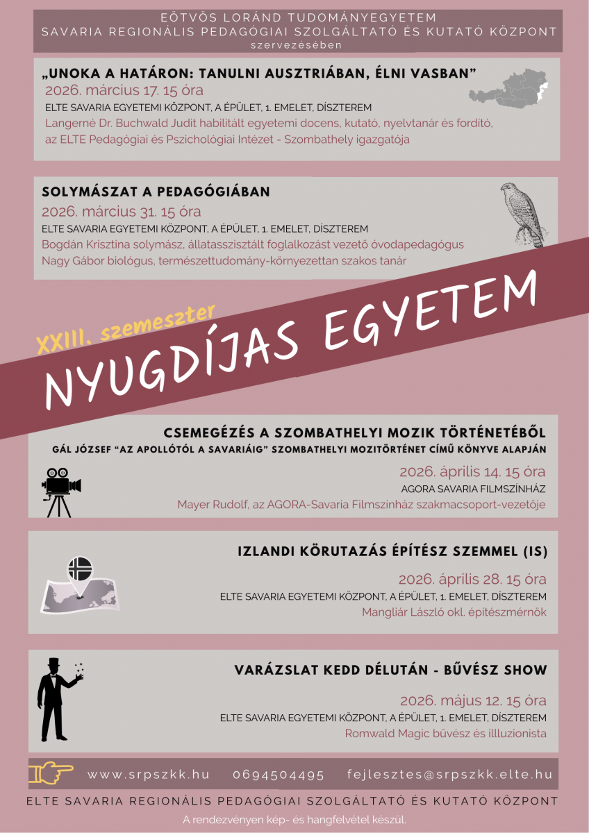 Az Eötvös Loránd Tudományegyetem Savaria Regionális Pedagógiai Szolgáltató és Kutató Központ szervezésében immáron a XXIII. szemesztere kezdődik a Nyugdíjas Egyetemnek.