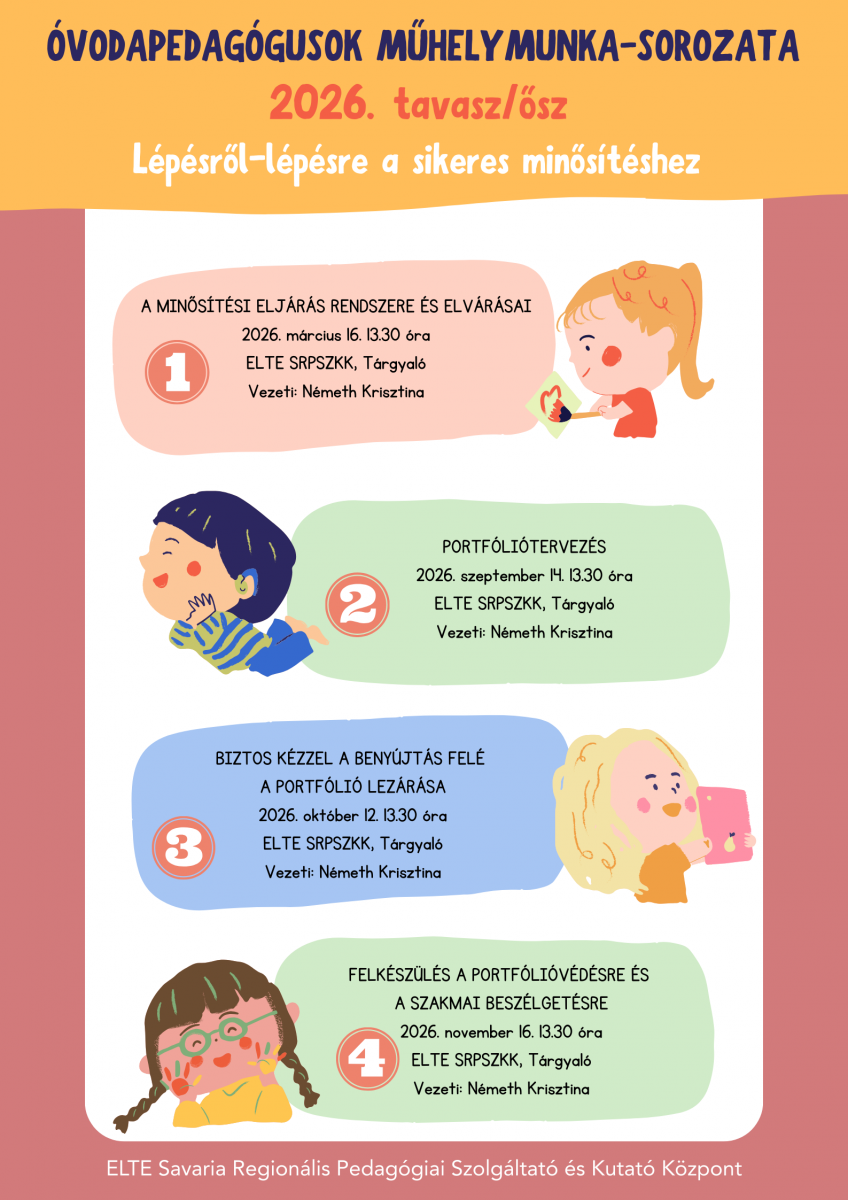 A minősülő óvodapedagógusokat várjuk műhelymunka-sorozatunk tavaszi és őszi programjaira. Az egész éves kurzus komplex, átfogó tématerület dolgoz fel.